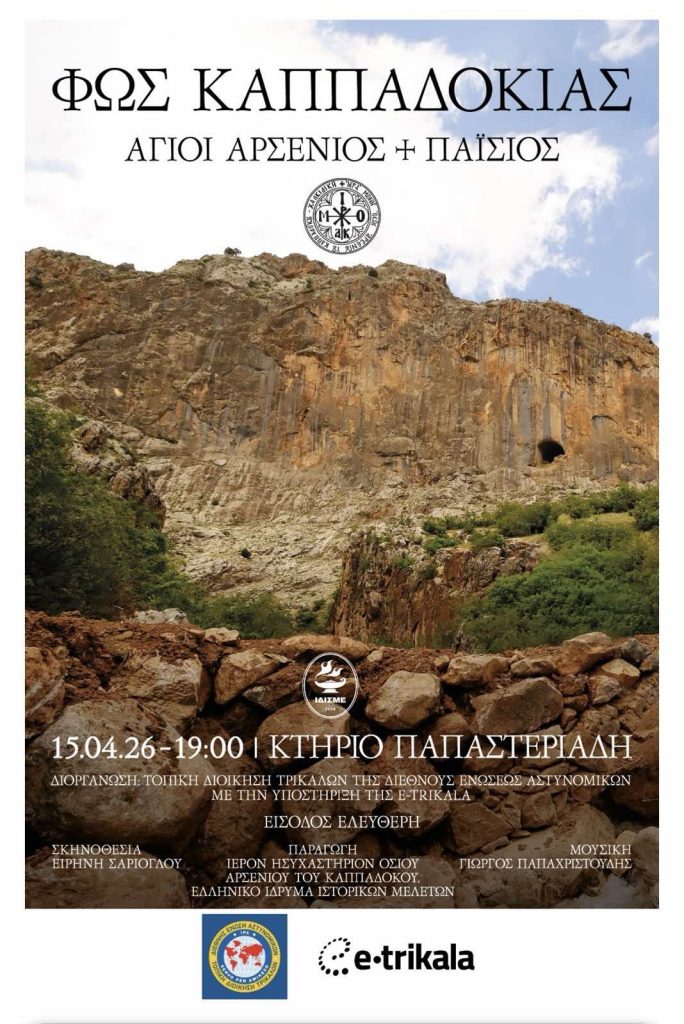 Την προβολή του ντοκιμαντέρ «Φως Καππαδοκίας: Άγιοι Αρσένιος + Παΐσιος» διοργανώνει η Τοπική Διοίκηση Τρικάλων της Διεθνούς Ενώσεως Αστυνομικών, την Τετάρτη 15 Απριλίου 2026 και ώρα 19:00, στην αίθουσα Παπαστεριάδη.